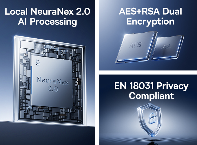 IA local, cifrado potente y cumplimiento estricto de los estándares de privacidad: NeuraNex 2.0, AES+RSA y EN 18031 trabajan juntos para mantener las imágenes de tu hogar protegidas contra accesos no autorizados.
