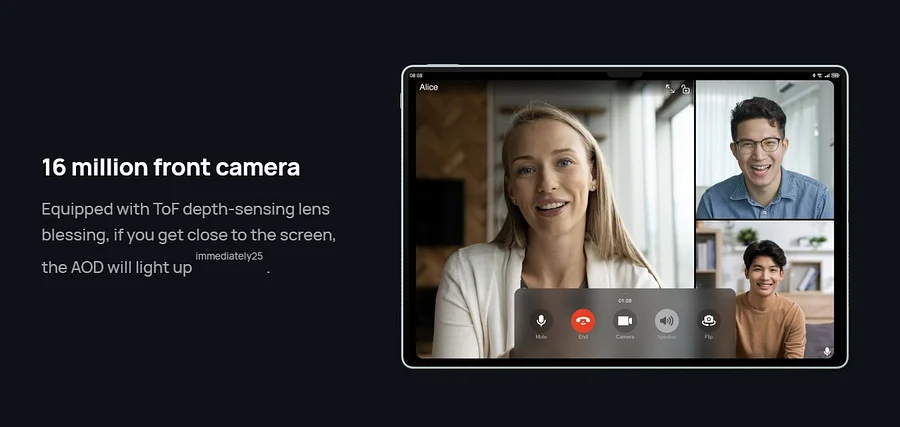 La cámara frontal de 16 megapíxeles puede restaurar el hermoso aspecto al tomar fotografías y grabar videos. Bendiciendo la lente de detección de profundidad ToF, cerca de la pantalla, AOD se ilumina instantáneamente 31. Encienda Shadow Follower 32 y cuando chatee en línea, puede permanecer en el centro de la imagen incluso cuando se mueve.
