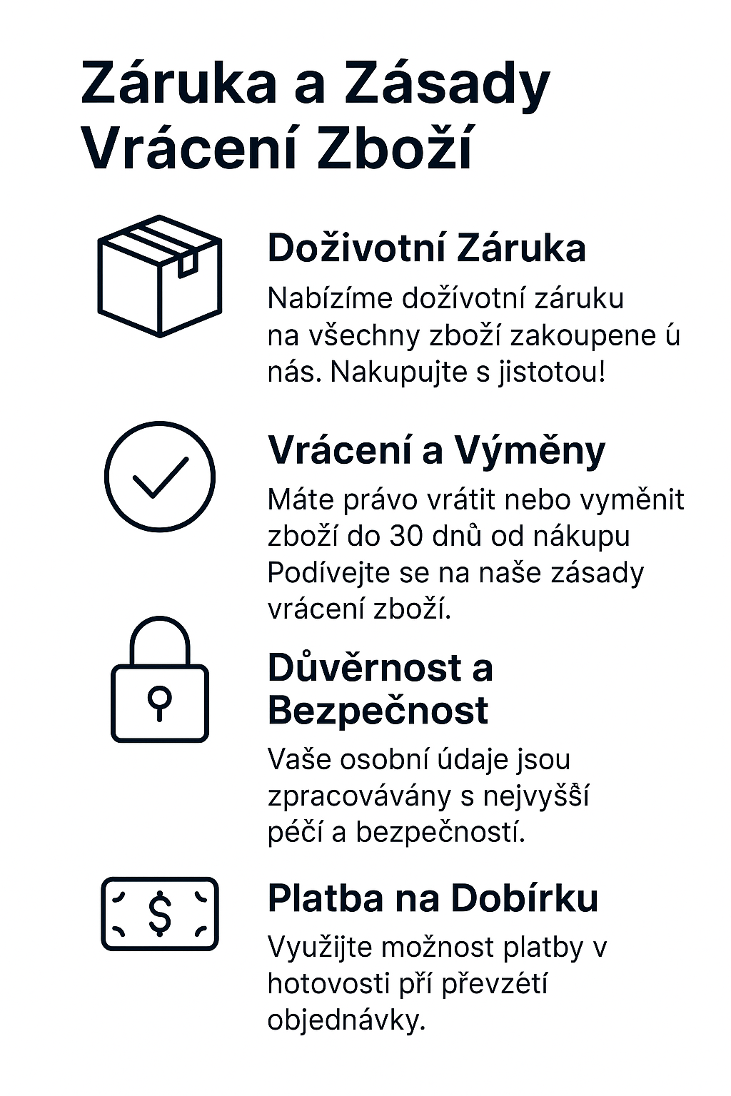 Všechny naše produkty jsou kryty doživotní zárukou, takže můžete nakupovat bez obav a stresu.