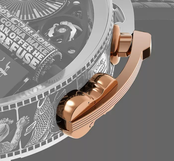Часовникът Godfather 50th Anniversary се помещава в 49-милиметров корпус от бяло злато с 13 емблематични сцени от филма, украсяващи страните на корпуса. Всяка сцена е гравирана върху кутията с помощта на иновативна високоинтензивна, високопрецизна фемто-лазерна технология, осигуряваща несравнима тръпка от реализъм. Процесът на гравиране във всеки случай отнема поне 30 часа под лазерен лъч.